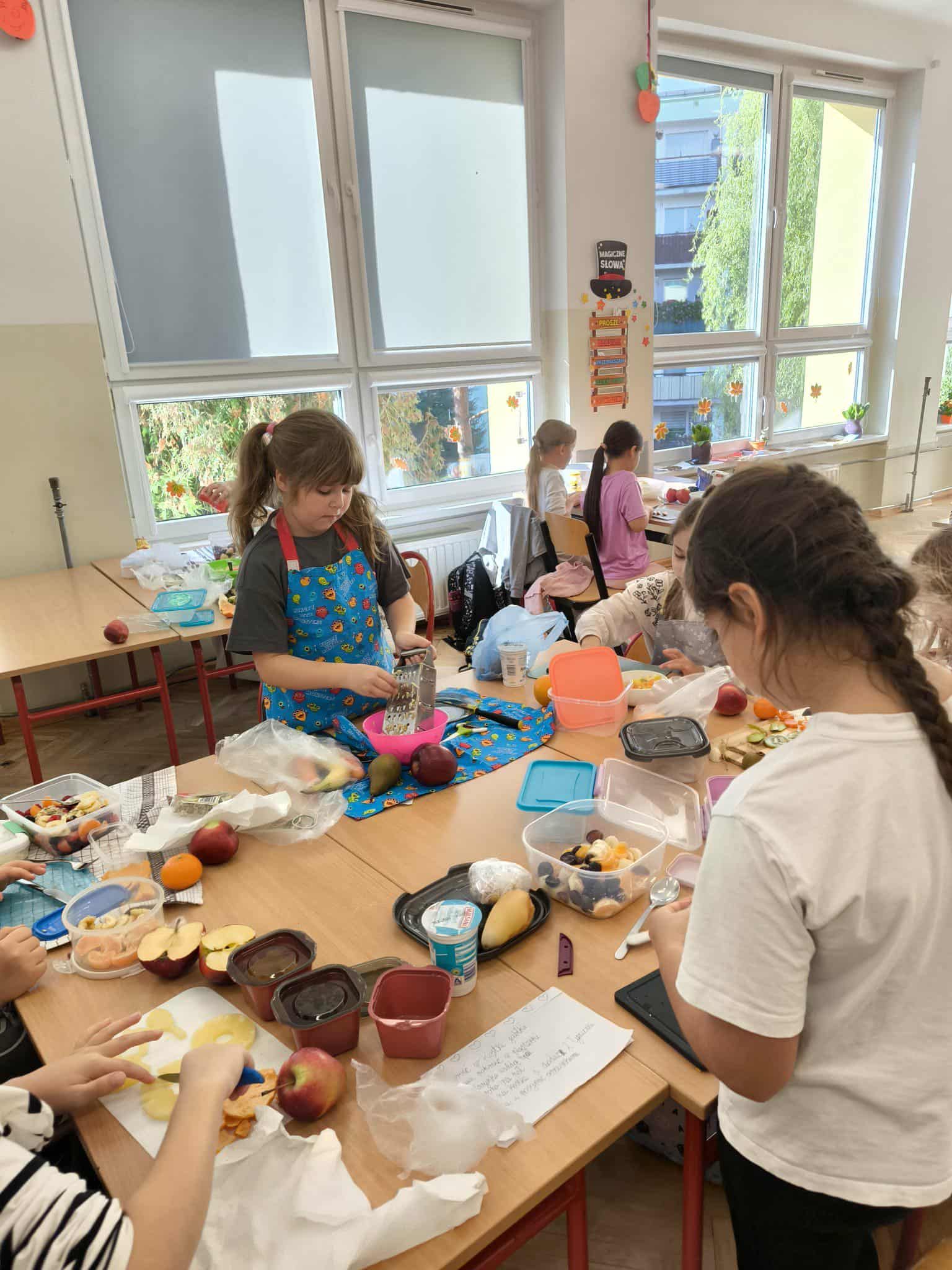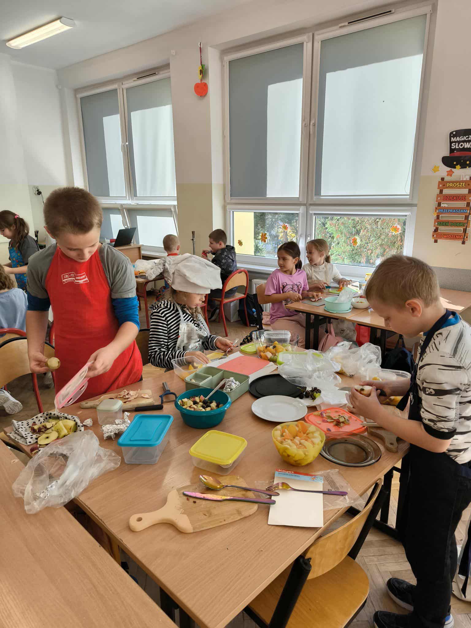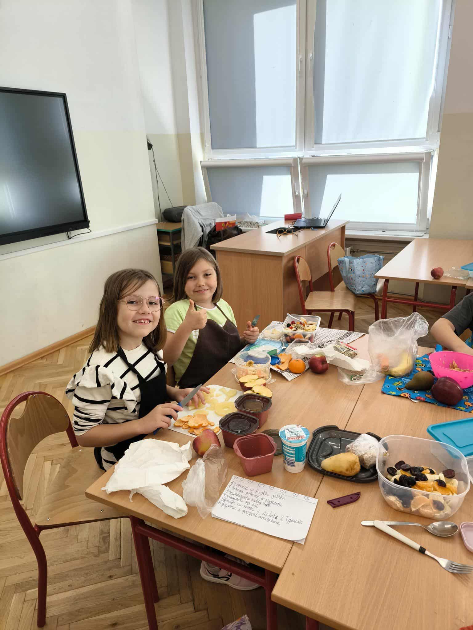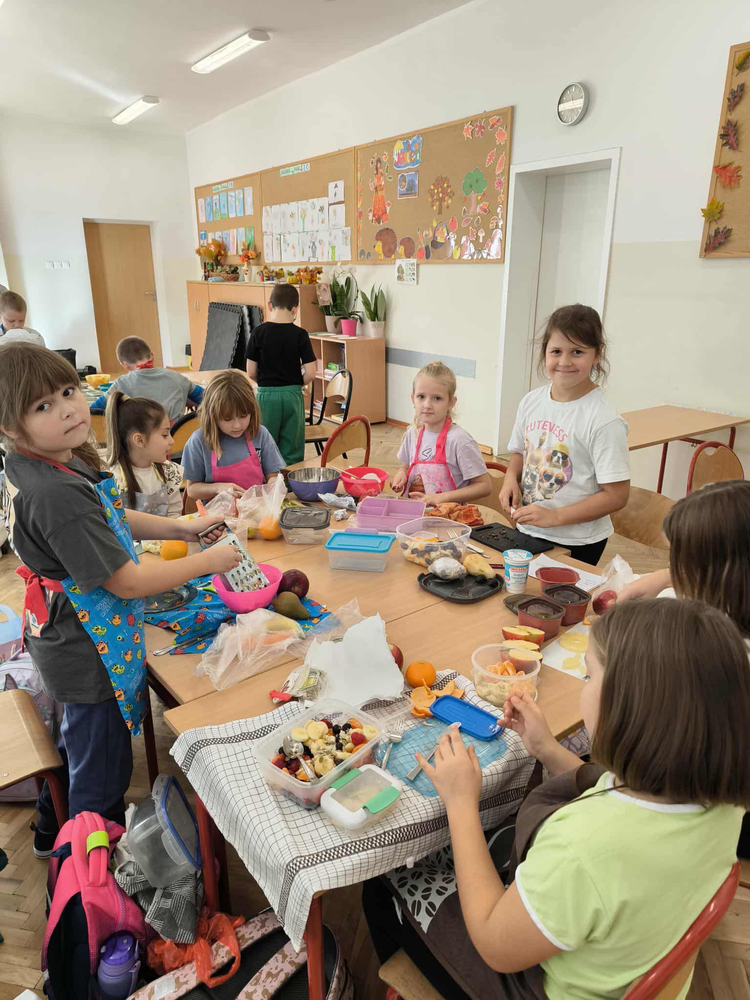 Na zakończenie bloku tematycznego „Skąd bierzemy to, co jemy” uczniowie klasy 2c wspólnie przygotowali pyszne i kolorowe sałatki owocowe. Dzieci z zaangażowaniem kroiły owoce, mieszały składniki i dekorowały swoje dania. Była to świetna okazja, by utrwalić wiedzę o zdrowym odżywianiu oraz wspólnie spędzić miło czas. Na koniec wszyscy z apetytem zajadali swoje kulinarne dzieła!