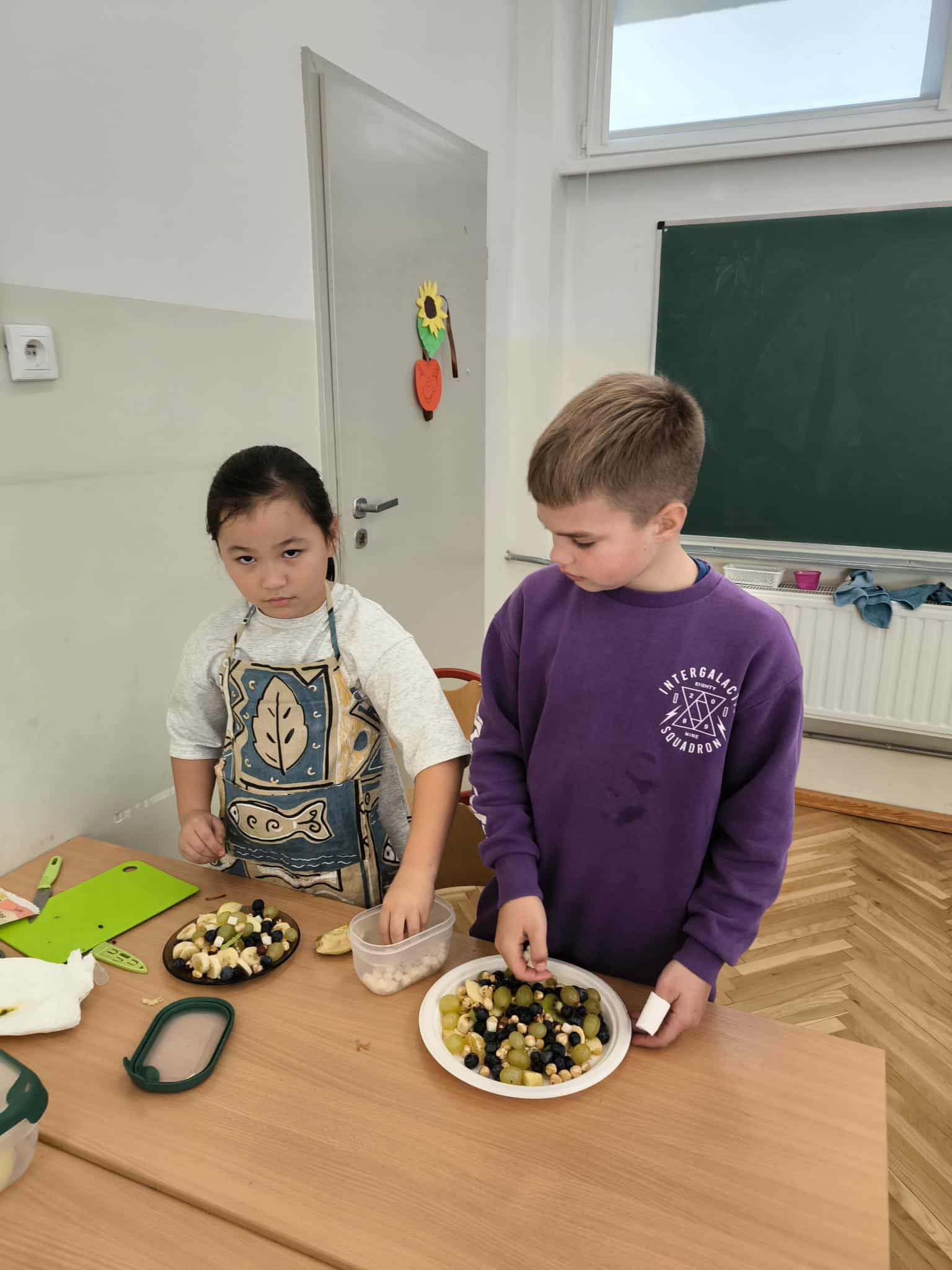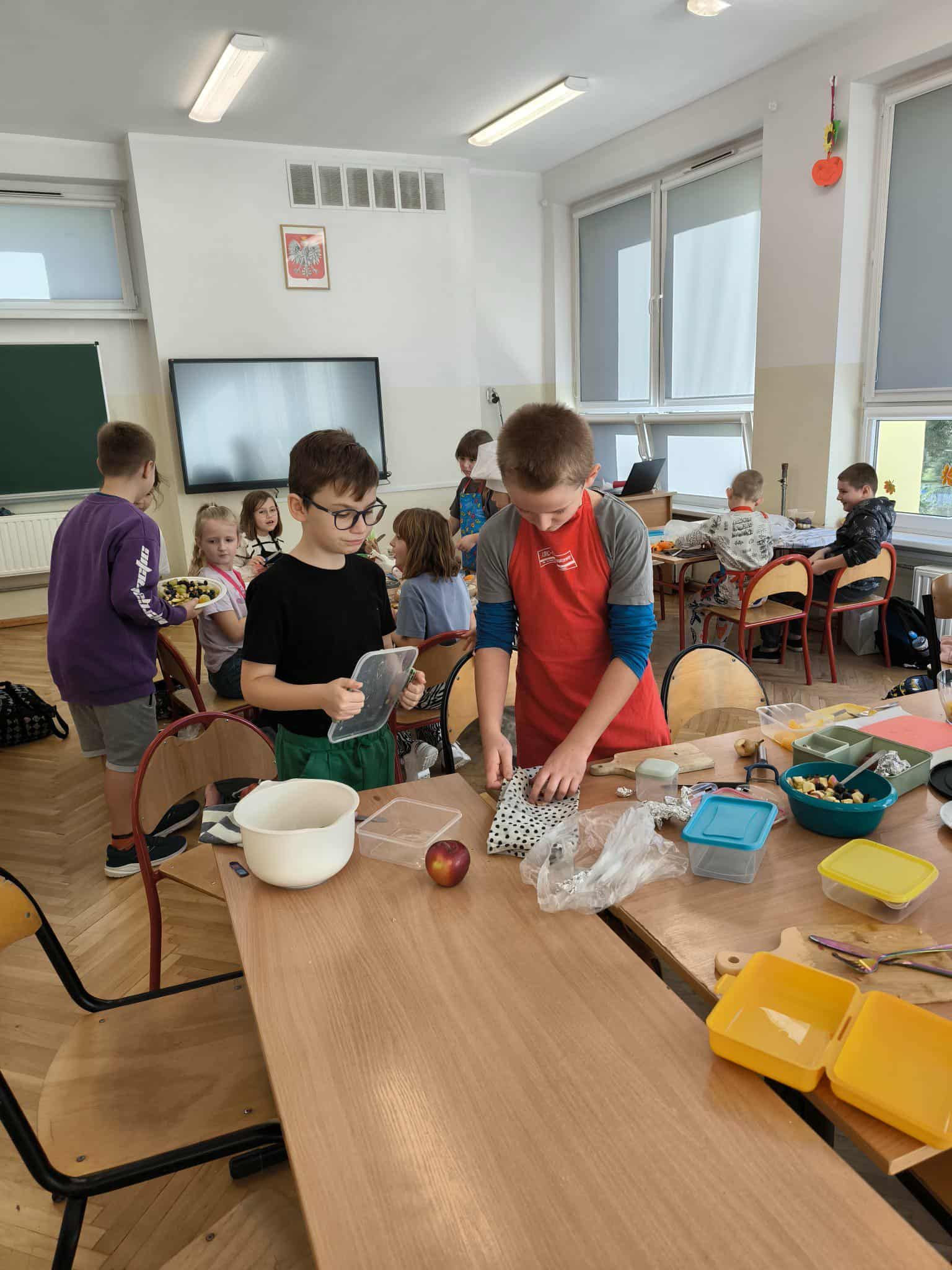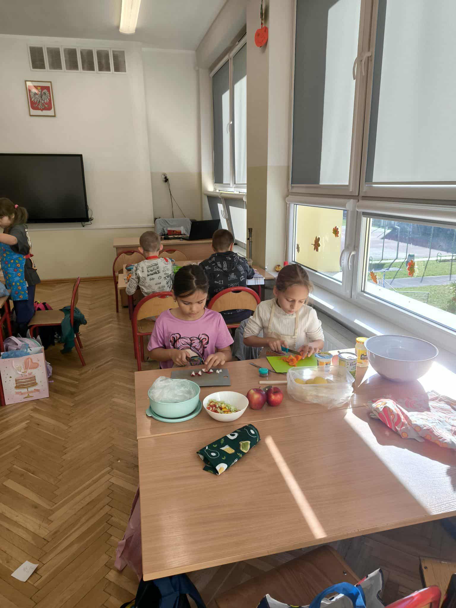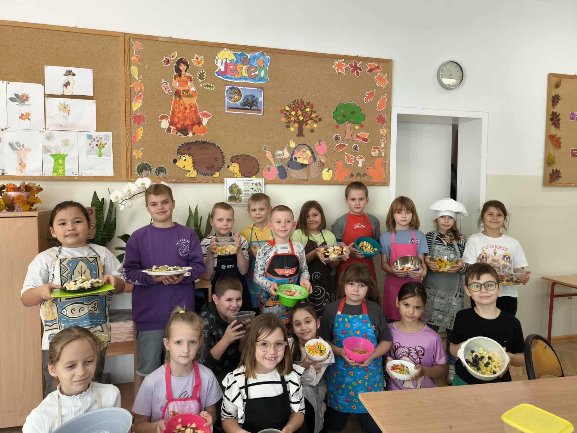 Na zakończenie bloku tematycznego „Skąd bierzemy to, co jemy” uczniowie klasy 2c wspólnie przygotowali pyszne i kolorowe sałatki owocowe. Dzieci z zaangażowaniem kroiły owoce, mieszały składniki i dekorowały swoje dania. Była to świetna okazja, by utrwalić wiedzę o zdrowym odżywianiu oraz wspólnie spędzić miło czas. Na koniec wszyscy z apetytem zajadali swoje kulinarne dzieła!